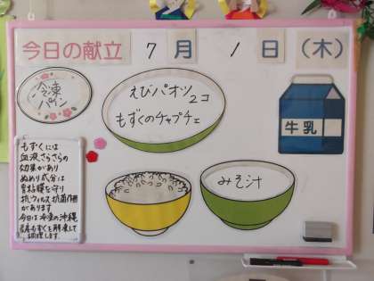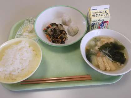 今日の給食 公開日 2021/07/01 更新日 2021/07/01 日々の活動から 7月1日(木) 今日の献立は、次のとおりです。 ○ごはん ○えびパオツ ○もずくのチャプチェ ○みそ汁(星型にんじん入り) ○冷凍パイン ○牛乳