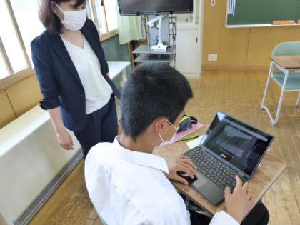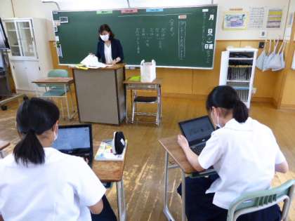 7月1日(木) 2年生の国語の授業の様子です。 タブレットを使ってプレゼンを作成していました。