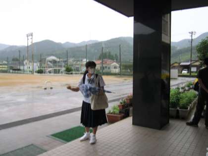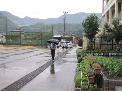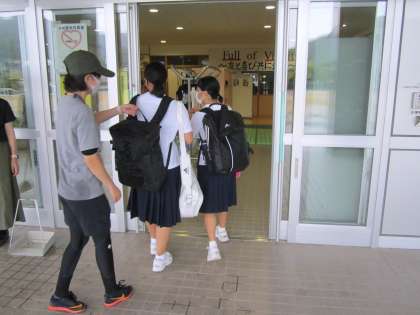 今日は、神通碧小学校の5、6年生が宿泊学習へ出かけるので、生徒玄関前で出迎える養護教諭もアウトドアスタイルです。