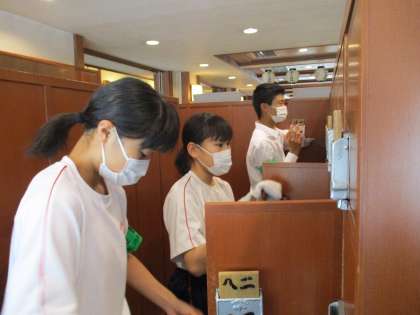 上の写真は、3人で下駄箱をきれいにしている様子です。