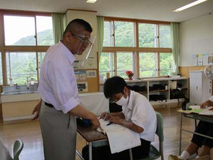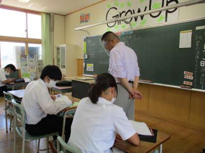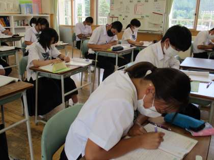 3年4限 数学 公開日 2021/07/13 更新日 2021/07/13 日々の活動から 7月13日(火) 3年生の数学の授業の様子です。 yがxの2乗に比例するときの「変化の割合」が実際の場面ではどんなことを表しているか考えてから演習問題に取り組みました。 どの生徒も一生懸命に取り組んでいました。