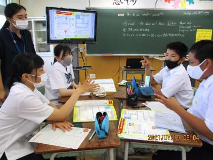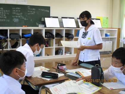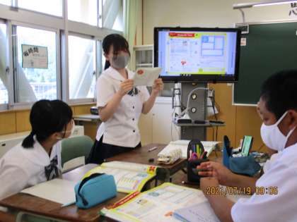 1年1限 英語 公開日 2021/07/19 更新日 2021/07/19 日々の活動から 7月19日(月) 1年生の英語の授業の様子です。 グループになって、それぞれが作った英作文を紹介し合いました。