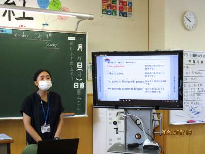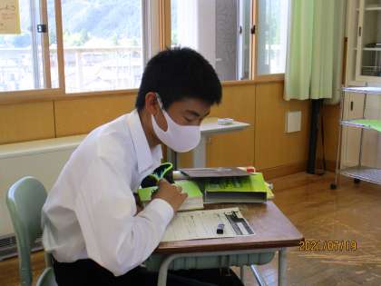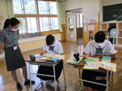 7月19日(月) 2年生の英語の授業の様子です。 学期の終わりはどの学年も積極的に英作文の学習をしています。