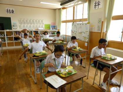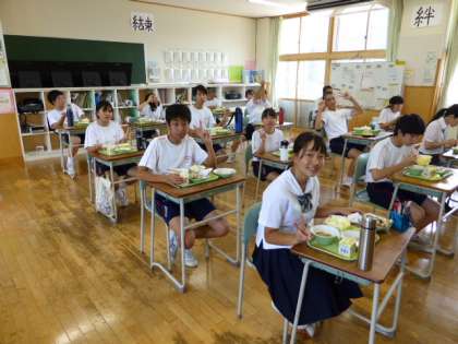 7月20日(火) 3年生の給食風景です。 とびきりの笑顔とポーズをいただきました。