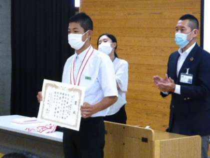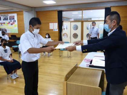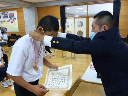 受賞伝達 公開日 2021/07/21 更新日 2021/07/21 日々の活動から 7月21日(水) 1学期の終業式に先立って、ボート部の先日行われた全国中学選手権競漕大会の受賞伝達を行いました。 男子シングルスカル 3位 女子舵手付きクォドルプル 3位 校長から賞状とメダルが手渡されました。