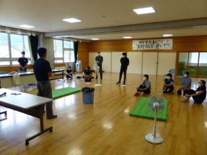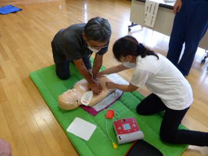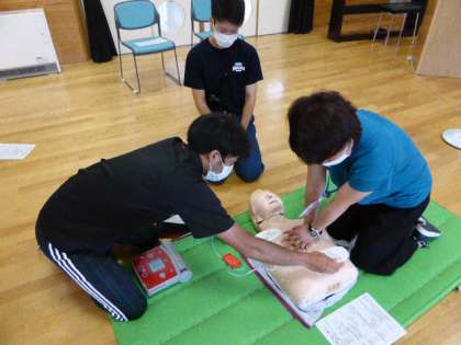 校内研修会 救命講習会 公開日 2021/07/26 更新日 2021/07/26 日々の活動から その後、実際を想定して、意識不明者を発見してからの動きを確認しました。 AEDをもってきて貼り付けてスイッチを押して電気ショックまで練習をしました。 最後に救急隊長さんから、さらに補足説明がありました。 細入分遣所の署員のみなさん、お世話くださった皆さんありがとうございました。