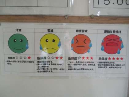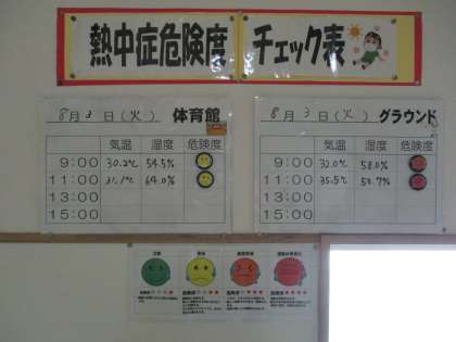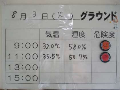 熱中症危険度チェック表 公開日 2021/08/03 更新日 2021/08/03 日々の活動から 8月3日(火) 本日富山県内に「熱中症警戒アラート」が発令されています。 本校では1日に4回、9時・11時・13時・15時にWBGT値、気温、湿度を計測しています。 またその値を掲示し、危険度をイラストで知ることができます。 普段から規則正しい生活やバランスのよい食事を心掛け、熱中症に負けない体力をつけましょう!