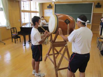 体育大会団活動 頑張っています! 公開日 2021/08/05 更新日 2021/08/05 日々の活動から 8月5日(木) 本日、夏期休業中3回目の体育大会団活動です。 それぞれの団で、演技の練習をしています。 音楽室では、太鼓の練習も行いました。