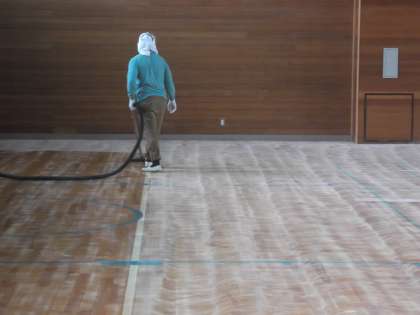 体育館のワックス掛け(作業途中) 公開日 2021/08/11 更新日 2021/08/11 日々の活動から 8月11日(水) 体育館のワックス掛け作業の途中経過です。 元々塗布してあったワックスを専用の機械で削りはがしました。 こうすることにより、ワックスをしっかり床に塗布することができるそうです。