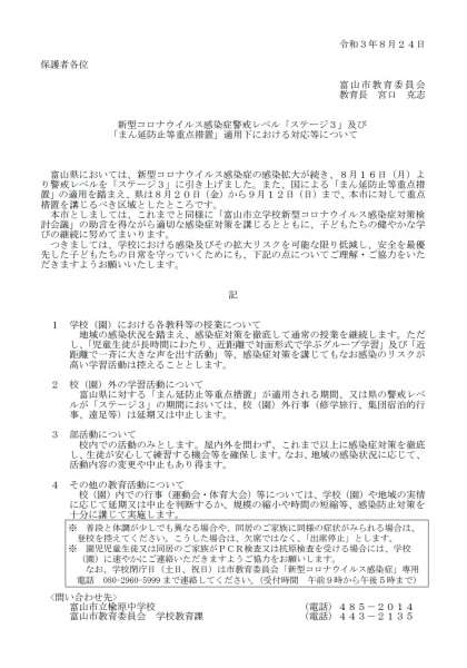 本日、市教委より「新型コロナウイルス感染症警戒レベル『ステージ3』及び『まん延防止等重点措置』適用下における対応等について」の文書が届きました。