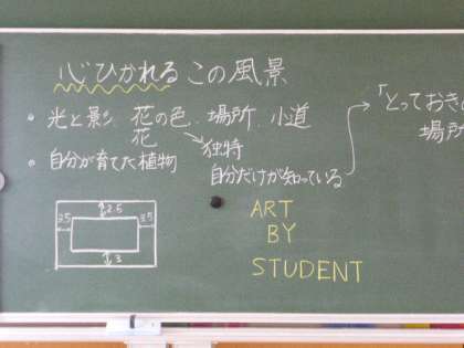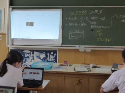 1年1・2限 美術 公開日 2021/08/31 更新日 2021/08/31 日々の活動から 8月31日(火) 1年生の美術の授業の様子です。 今後、風景画を描いていくための準備として、1限目はタブレットを使ってお気に入りの風景を撮影してきました。 撮影した風景を見ながら、風景画を描いていきます。
