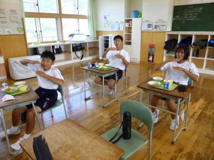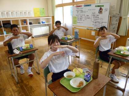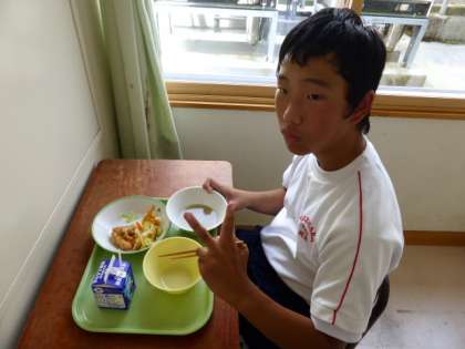 8月31日(火) 1年生の給食風景です。 放送当番の生徒もいました。