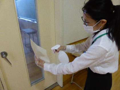 本校では、昨年度からずっと写真のように消毒作業を職員が分担して行っています。