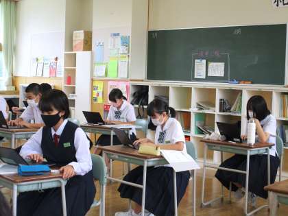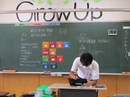 3年1限 「総合的な学習の時間(楡の木タイム)」 公開日 2021/09/03 更新日 2021/09/03 日々の活動から 9月3日(金) 3年生の「総合的な学習の時間(楡の木タイム)」の様子です。 SDGsに関連して「私たちの未来へ」をテーマに調べたことを発表する準備をしていました。