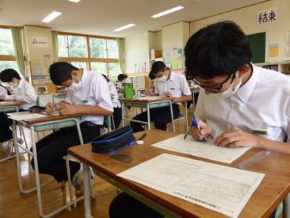 3年1限 数学 公開日 2021/09/07 更新日 2021/09/07 日々の活動から 9月7日(火) 3年生の数学の授業の様子です。 「相似な三角形をかくにはどうすればよいだろうか?」が学習課題でした。 2年生で学習した三角形の合同条件を思い出しながら、相似な三角形を全員がかくことができました。