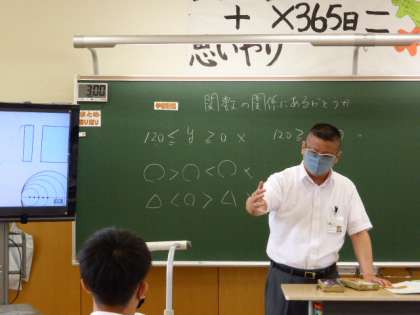 1年3限 数学 公開日 2021/09/07 更新日 2021/09/07 日々の活動から 9月7日(火) 1年生の数学の授業の様子です。 変域について確認した後で、「関数の関係と言えるのはどんなときか」考えました。 例えば「身長は年齢の関数である」と言えるかどうか・・・