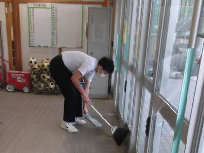 今朝は風が強く、生徒玄関の戸が開くと風で飛ばされるので、登校してくる生徒が生徒玄関に入る前に素早く、掃除をするようにしていました。