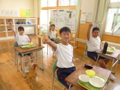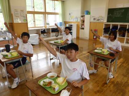 9月9日(木) 1年生の給食風景です。 今日もいい笑顔をたくさんいただきました。