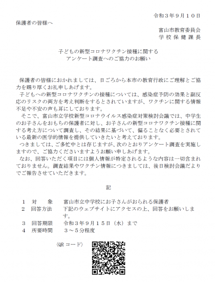 富山市教育委員会から「子どもの新型コロナワクチン接種に関するアンケート調査へのご協力のお願い」がありました。プリントについては、来週13日(月)に配付しますので、ご確認いただき、ご回答をお願いします。文書は、右の配布文書からもご覧になれます。