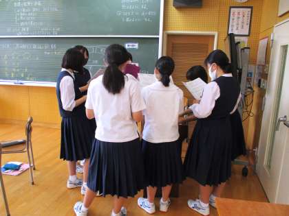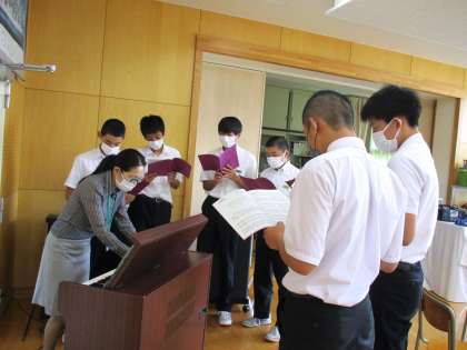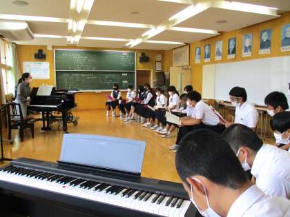 3年1限 音楽 公開日 2021/09/13 更新日 2021/09/13 日々の活動から 9月13日(月) 3年生の音楽の授業の様子です。 「群青」という曲を全体で練習した後で、パート別で練習しました。