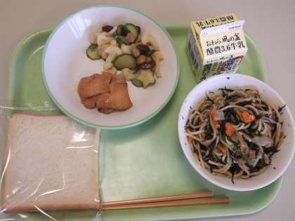 今日の給食 公開日 2021/09/13 更新日 2021/09/13 日々の活動から 9月13日(月) 今日の献立は、次のとおりです。 ○減量パン ○ベーコンとひじきの和風スパゲティ ○照り焼きチキン ○ビーンズサラダ ○牛乳 今日は「ベーコンとひじきの和風スパゲティ」の中には、小さくかわいいハート型にんじんが入っていました。 また「ビーンズサラダ」には、星型きゅうりが入っていました。