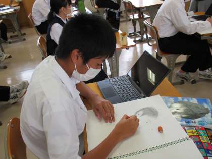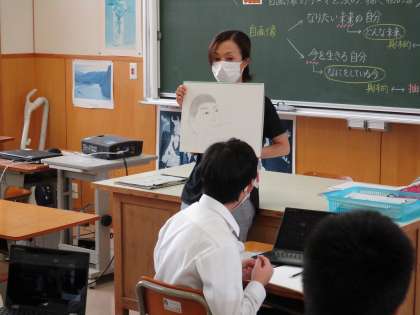3年3限 美術 公開日 2021/09/14 更新日 2021/09/14 日々の活動から 9月14日(火) 3年生の美術の授業の様子です。 タブレットを使って自分の顔の写真を撮って、その写真を見て「自画像」を描いていました。