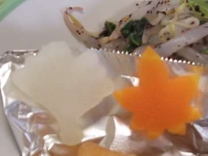 今日は「みそ汁」の中は、様々な植物の葉が型抜きされて入っていました。