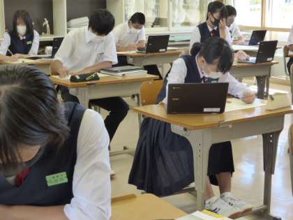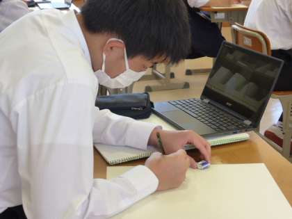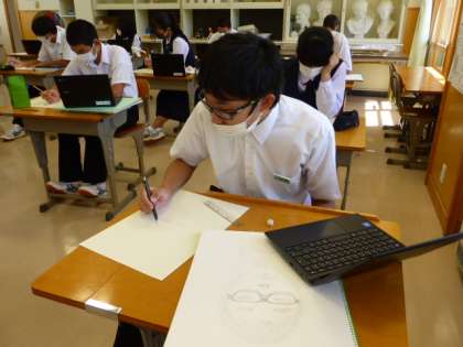 3年3限 美術 公開日 2021/09/21 更新日 2021/09/21 日々の活動から 9月21日(火) 3年生の美術の授業の様子です。 タブレットに保存してあった自分の顔の写真を見ながら、自画像を描いています。