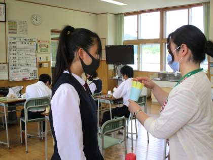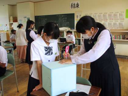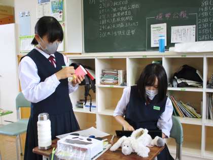 9月22日(水) 家庭科の授業の様子です。 幼児のおもちゃ作りをしています。