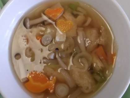 今日の「すまし汁」の中には、型抜きされた小魚とハート型の人参が入っていました。