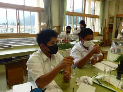 1年6限 理科 公開日 2021/09/24 更新日 2021/09/24 日々の活動から 9月24日(金) 1年生の理科の授業の様子です。 食塩と硝酸カリウムの水溶液について、水溶液の温度を下げて中の変化の様子を観察していました。