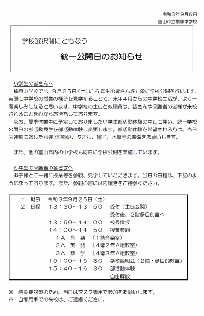 本日の「統一学校公開日」は、予定どおり実施します。