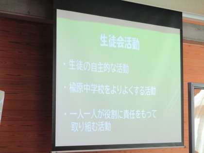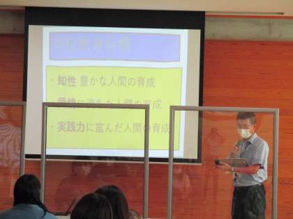 統一学校公開日 学校紹介 公開日 2021/09/25 更新日 2021/09/28 日々の活動から 9月25日(土) 授業参観の後に、学校紹介を行いました。 生徒会執行部による学校紹介、教務主任による説明の様子です。 学校行事や生徒会活動、部活動について説明しました。 少しでも、中学校での学校生活がイメージできたでしょうか。 楡原中学校に入学され、一緒に活動できることを楽しみにしています。