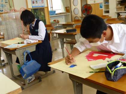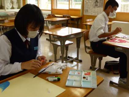 9月28日(火) 2年生の美術の授業の様子です。 一所懸命に色塗りをしていました。