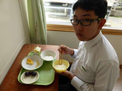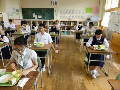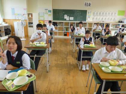9月30日(木) 3年生の給食風景です。 放送当番の生徒もいました。
