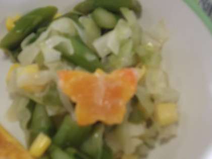 今日は「シチュー」の中に、型抜きされた《チョウチョ》が溺れていたので、アスパラサラダの上に救出しました。