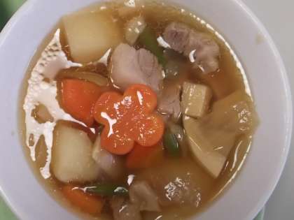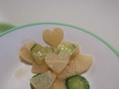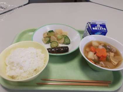 今日の給食 公開日 2021/10/01 更新日 2021/10/01 日々の活動から 10月1日(金) 今日の献立は、次のとおりです。 ○ごはん ○豚肉とじゃがいものうま煮 ○いわしの土佐煮 ○華風あえ ○牛乳 今日は「華風あえ」の中に、ハート型に型抜きされた《きゅうり》と《だいこん》がたくさん入っていて、たっぷりの愛情を感じました。 また、「豚肉とじゃがいものうま煮」には、大きな花模様の《にんじん》が入っていました。