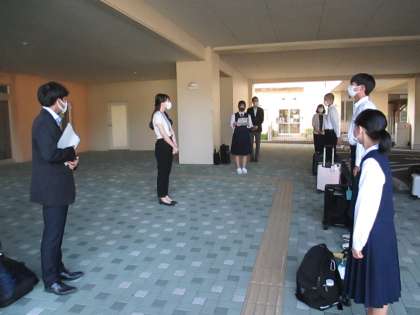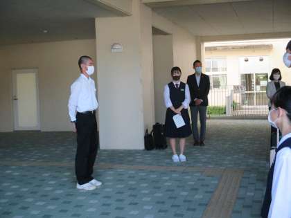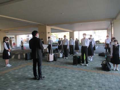 3年 修学旅行 1日目 公開日 2021/10/05 更新日 2021/10/05 日々の活動から 10月5日(火) 好天に恵まれ、今日から待ちに待った3年生の修学旅行が始まりました。 出発式の様子です。 添乗員さんの紹介、生徒代表挨拶、諸注意がありました。