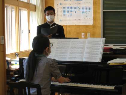2年3限 音楽 公開日 2021/10/07 更新日 2021/10/07 日々の活動から 10月7日(木) 2年生の音楽の授業の様子です。 学習発表会の合唱曲「もみじ」「群青」「コスモス」を練習しました。 パート練習をしてからみんなで合唱しました。