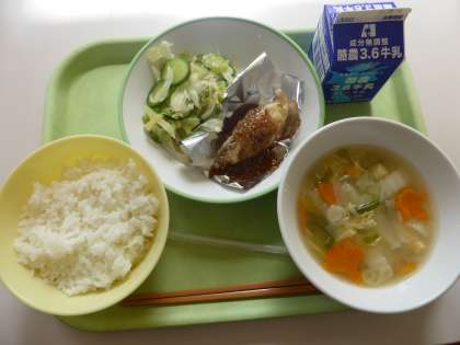 本日の給食 公開日 2021/10/08 更新日 2021/10/08 日々の活動から 10月8日(金) 今日の献立は、次のとおりです。 ○ごはん ○大ふくらぎのごまだれかけ ◯あわせあえ ◯五目みそ汁 ○牛乳 今日は五目みそ汁の中に「いちょう」と「もみじ」の形の《にんじん》が入っていました。 うれしい気持ちになりました。