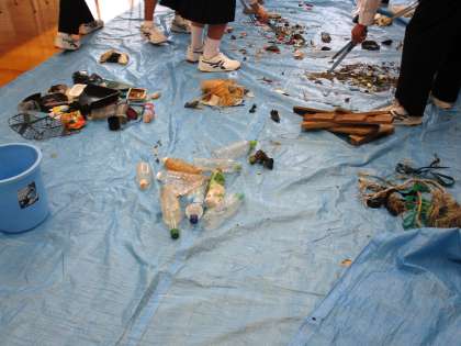 先週の校外学習で集めてきた岩瀬浜の漂着ゴミを分類しています。