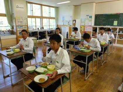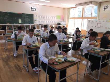 3年 給食風景 公開日 2021/10/14 更新日 2021/10/14 日々の活動から 10月14日(木) 3年生の給食風景です。 テストの座席でした。 3年生にも「かき揚げうどん」にして食べている人がいました。