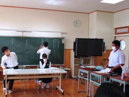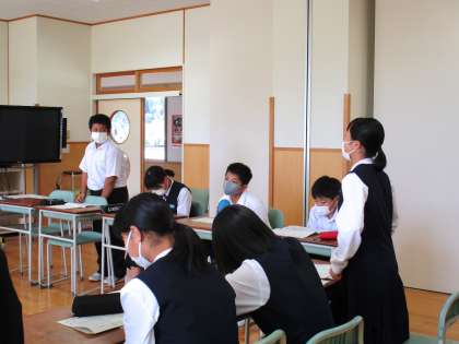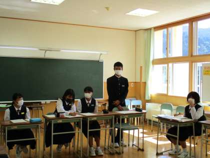 1・2年 合同学級討議 公開日 2021/10/15 更新日 2021/10/15 日々の活動から 10月15日(金) 1・2年生は、視聴覚室において合同で学級討議をしました。 執行部や各実践部から提案があり、それに対して質問や意見を出しあっていました。