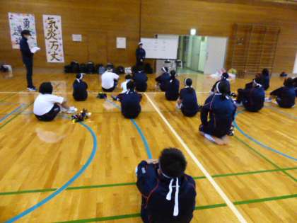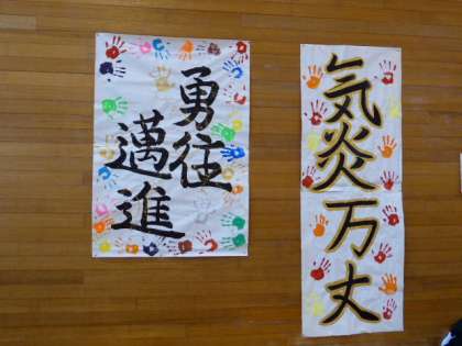 放課後 団別集会 まとめ 公開日 2021/10/20 更新日 2021/10/20 日々の活動から 最後は実行委員会から諸注意がありました。 明日は晴れて予行練習ができるといいですね。 体育館の壁面に各団のスローガンが掲示されました。