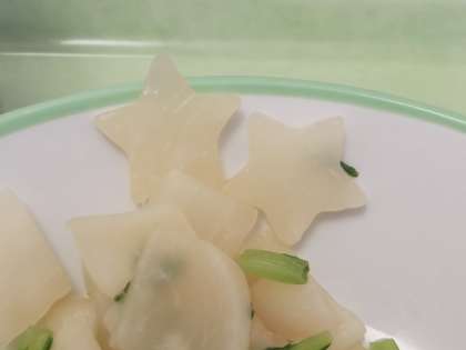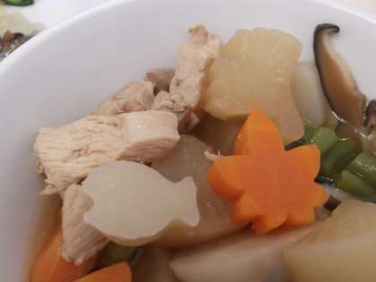 今日は「大根と鶏肉のうま煮」の中にもみじ型の《にんじん》、いちょう型の《大根》、そして小魚型の《こんにゃく》が入っていました。
