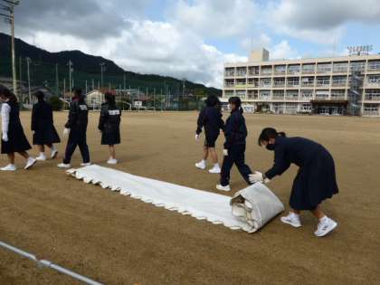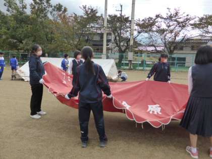 4限 テント等片付け 公開日 2021/10/26 更新日 2021/10/26 日々の活動から 10月26日(火) 土曜日は、体育大会の途中に雨が降ったためテントが濡れていて片付けることはできませんでした。 今日は、朝から太陽が照っていたので、日なたでテントを乾かし、4限目に後片付けをすることとしました。