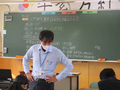 2年1限 社会 公開日 2021/10/27 更新日 2021/10/27 日々の活動から 10月27日(水) 2年生の社会の授業の様子です。 「江戸時代後半どんな文化が栄えたか?」という内容の学習をしました。