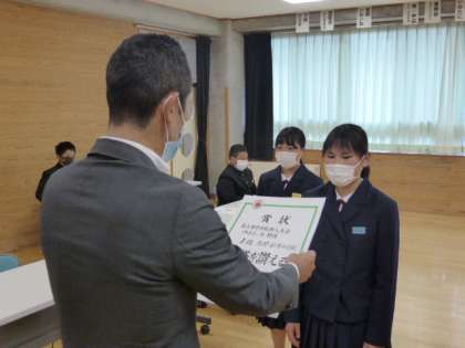 生徒会長の終わりの言葉の後、ソフトボール部が新人戦で3位になった受賞伝達を行いました。