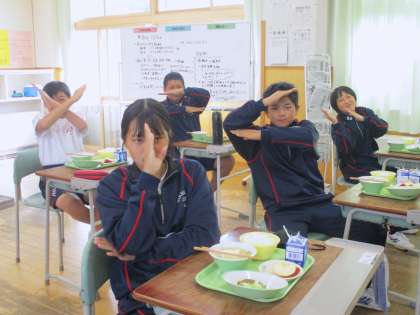11月1日(月) 1年生の給食風景です。 今日も楽しいポーズをありがとうございました。