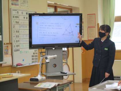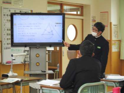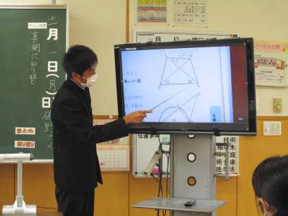 3年5限 数学 公開日 2021/11/01 更新日 2021/11/01 日々の活動から 11月1日(月) 3年生の数学の授業の様子です。 「円周角の定理の逆の定理」について学習しました。 写真は、生徒が説明している場面です。 さすが3年生です。 説明がとても分かりやすかったです。 中学校生活も残り5か月となりました。 さらに説明する表現力を高めていきましょう。